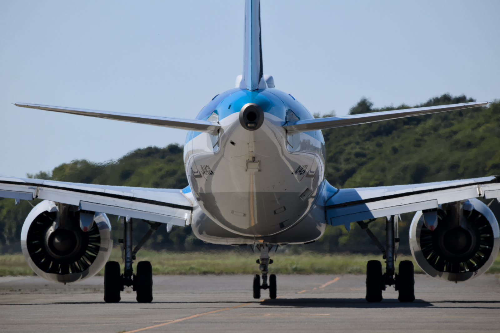 燃費改善効果を検証するため、機体腹部に鮫肌加工が施された当機。