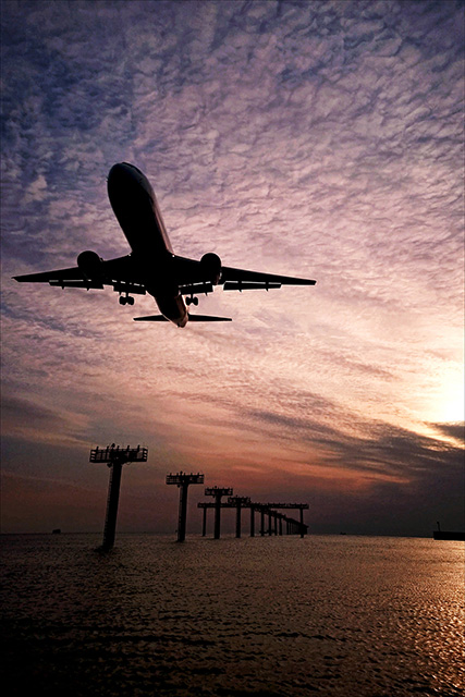 台風が過ぎ去った翌日、綺麗な青空に飛び立とうとする飛行機の姿がありました。