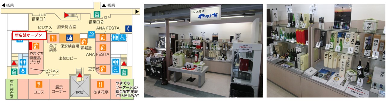 2022.05.03新店舗「山口銘酒やなぎだ」オープンのお知らせ 国内線旅客ターミナル2階やまぐち特産品プラザ内に 「山口銘酒やなぎだ」がオープンしました。 山口県の地酒を数多く取り揃えていますので、 空港にお立ち寄りの際は、ぜひご利用ください。 〈店舗〉案内図